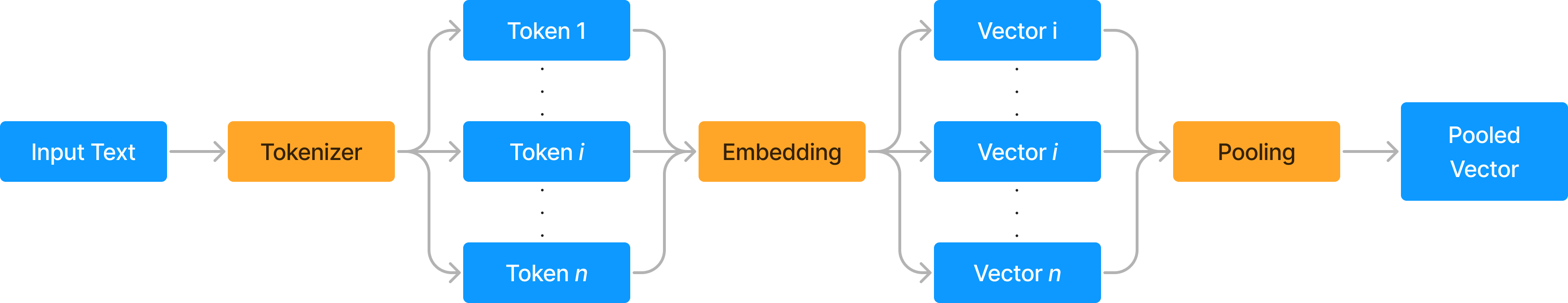 이러한 모델에서는 주어진 입력을 먼저 토크나이저를 이용해 토큰으로 분리하고, 각 토큰들의 벡터 임베딩을 생성한 후, 이 벡터들을 조합하여 전체 문서를 대표하는 하나의 벡터를 만드는 과정을 거칩니다. 대표 벡터를 만드는 방법에는 벡터의 평균을 이용하는 평균 임베딩 방법, 단어의 등장 빈도를 이용하는 TF-IDF 가중치 방법, 딥 러닝 모델을 사용하는 방법 등이 있습니다.
