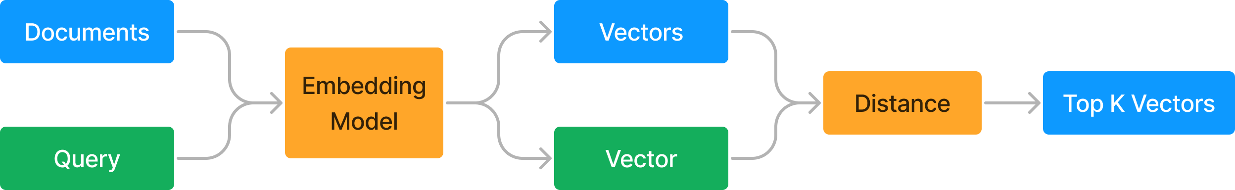 텍스트는 토크나이저와 임베딩을 거쳐 벡터가 됩니다. 토큰화와 임베딩을 합해서 그냥 임베딩이라고 이야기하기도 합니다. 벡터를 이용한 검색 과정에 대해 생각해봅시다. 문서를 문단, 문장 등 작은 단위(chunk)로 분리하고 각각을 벡터로 만들어 저장해 놓습니다. 질문이 들어왔을 때 질문도 임베딩 벡터로 만들면 저장된 벡터와 질문의 임베딩 벡터 사이의 거리를 계산할 수 있습니다. 거리가 가까운 벡터는 질문과 관련된 내용을 포함할 가능성이 높습니다. 이렇게 질문과 관련된 벡터를 찾는 과정이 벡터 검색입니다.
