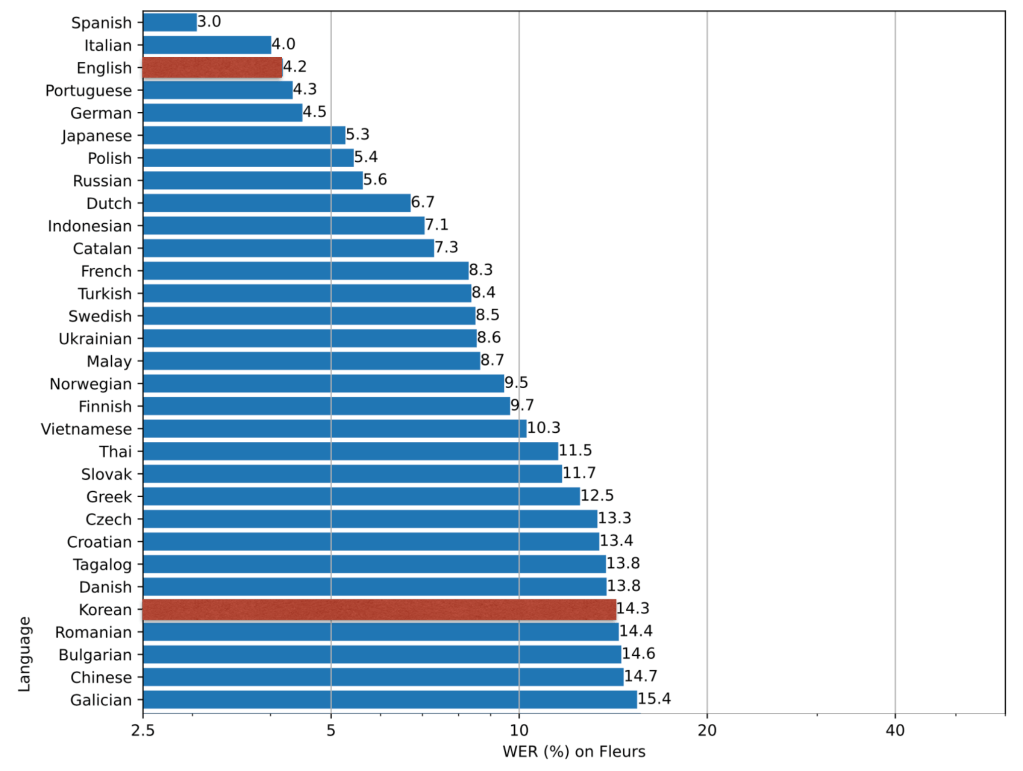 VRAM은 open source 프로그램을 받아서 GPU로 실행할 때 필요한 비디오 메모리 용량을 의미합니다. 영어 전용 모델도 있는데, 여기서는 다국어 모델을 사용하겠습니다. 오류율(Word Error Rate)을 보면, 영어의 경우 4.2% 정도를 틀리게 받아쓰고, 한글의 경우 14.3% 정도를 틀린다고 하네요.